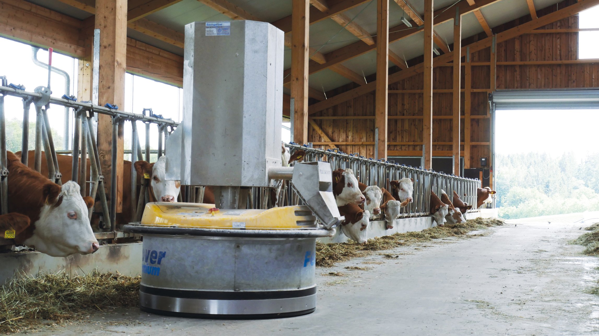 Bei der Inbetriebnahme werden die gewünschten Routen einmalig über das Touchpanel des FeedRovers eingegeben. Während die erste Fahrt noch mit einem größeren Abstand zu dem Fressgitter erfolgt, verringert sich dieser bei jeder weiteren Fahrt automatisch um ca. 5 Zentimeter. Der rotierende Anschiebekörper fördert das Futter ohne Verschleppung direkt zum Barren. Die einmal programmierte Route wird dann dauerhaft und verlässlich eingehalten.